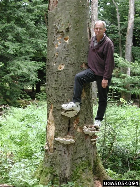 Figure 4. Bracket fungus commonly known as artist’s conk (Ganoderma applanatum) growing on an American beech. Source: Joseph O’Brien, USDA Forest Service.