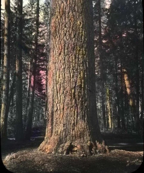 Figure 11. The number of large sugar pines is decreasing. This is a hand-painted lantern slide of a large sugar pine near Crater Lake, Oregon. Source: Oregon State University Special Collections and Archives Center.