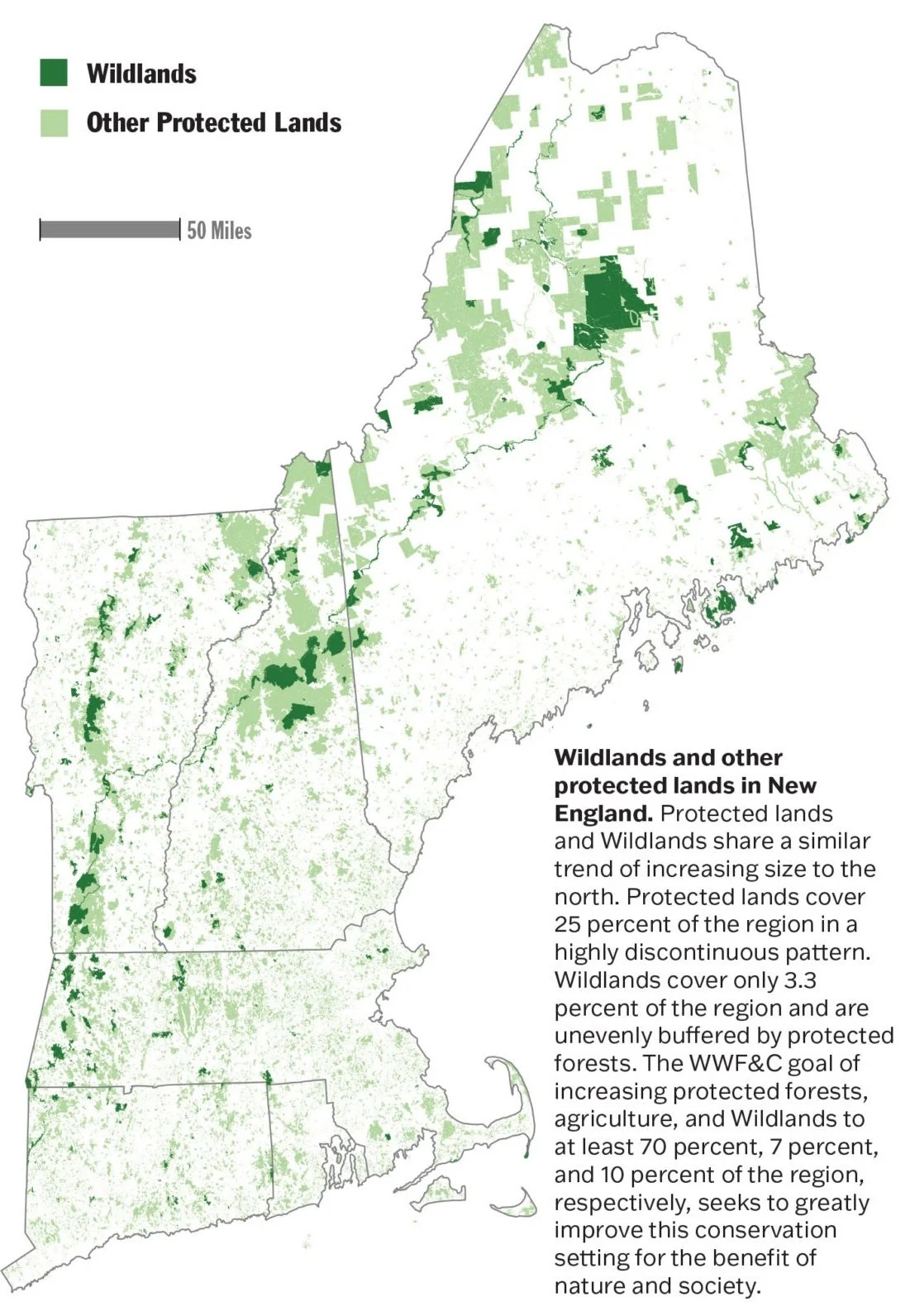 Figure 6. As defined in Wildlands in New England, Wildlands are a subset of protected lands, the vast majority of which cannot be developed further but can continue to be logged. Source: Foster et al. 2023.