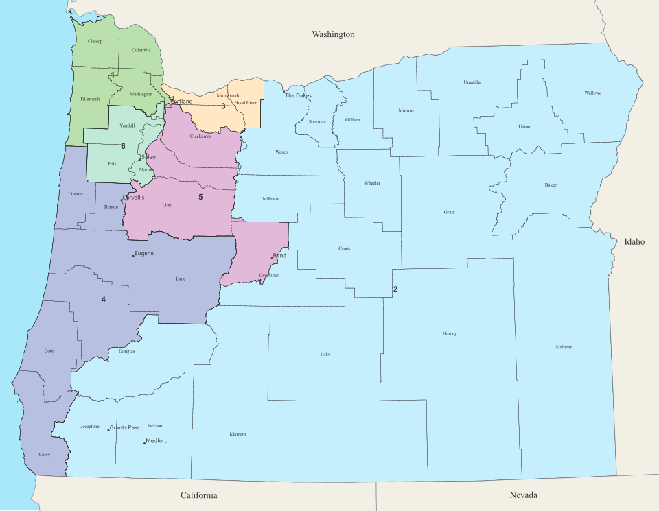 Figure 4. Oregon’s six congressional districts: 1st, light green (Bonamici); 2nd, light sky blue (Bentz); 3rd, moccasin (Dexter); 4th, medium purple (Hoyle); 5th, plum (Bynum); 6th, light greenish-blue (Salinas).